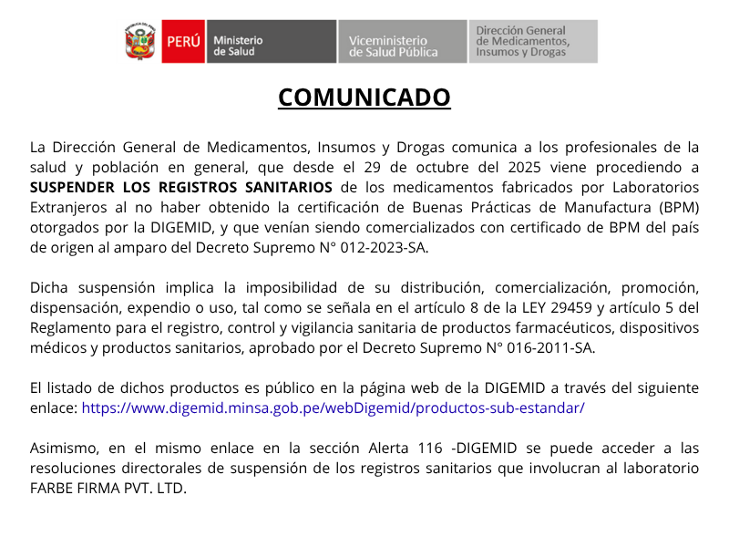 Comunicados Principales emitidos por la Dirección General de Medicamentos Insumos y Drogas